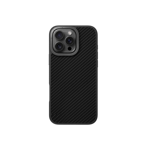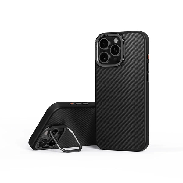 Armadura para tu iPhone. Fabricado con auténtica fibra de aramida, Keva Max eleva la protección al siguiente nivel, ofreciendo un escudo robusto contra los golpes más duros. El soporte integrado se despliega sin esfuerzo desde la lente de la cámara, facilitando la visualización manos libres.